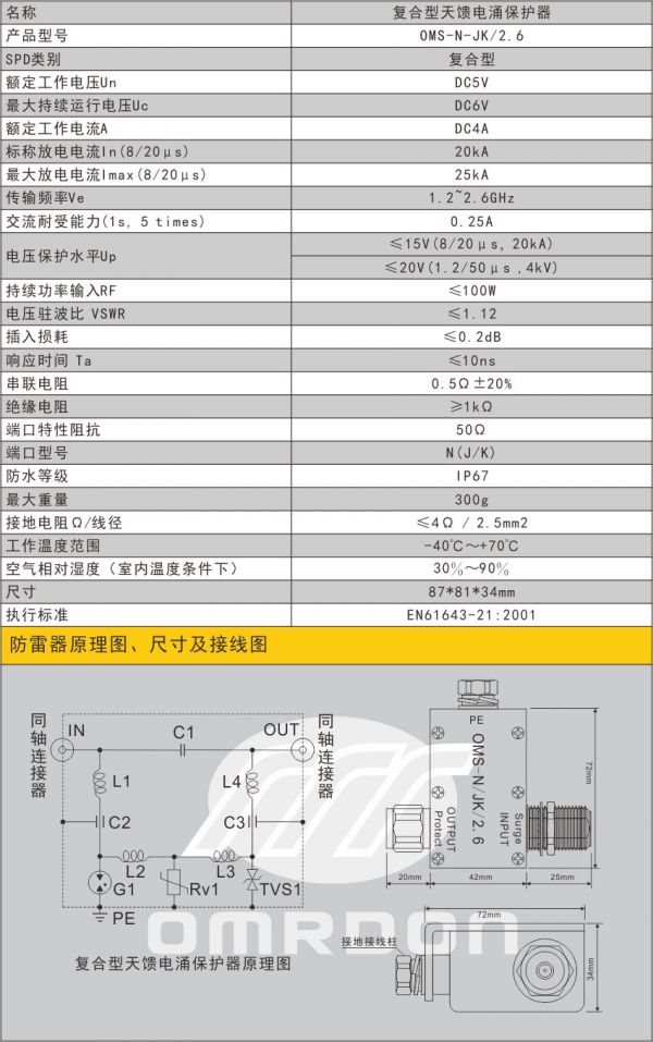 歐姆雷盾(OMRDON)1.2-2.6G天饋電涌保護器(SPD、防雷器)是專門為GPS/BD通訊基站通信頻段收發(fā)系統(tǒng)設(shè)計,使其免遭由天饋線引入的感應(yīng)雷擊及靜電放電等過電壓損壞。本產(chǎn)品具有防水、防塵功能,可用于室外安裝場所。